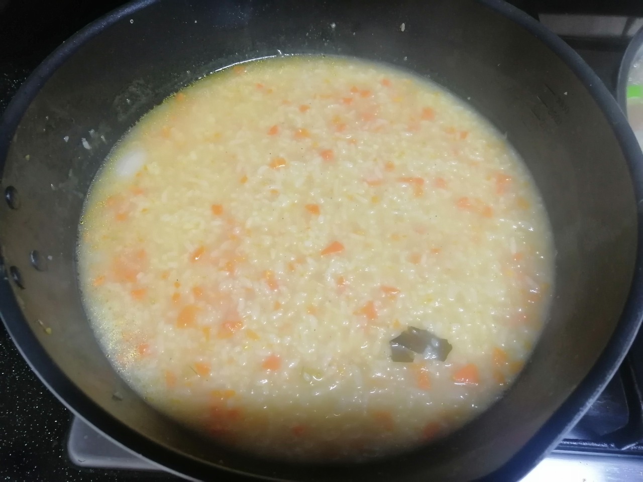 뚜껑을 덮고 5분간 더 끓여줍니다. (쌀알이 바닥에 눌러붙지 않도록 뚜껑을 열어 가끔 가끔 저어줍니다.)