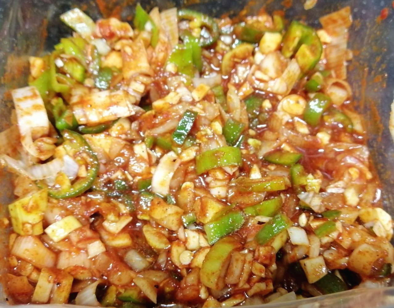 다진 마늘 6개, 다진 청양고추 4개, 다진 홍고추 1개, 다진 양파 반쪽, 다진 대파 반쪽